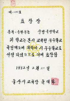 울산시교육청 순환운동 분야 시우수학교에 선정된 신명국민학교 표창장이다.