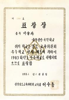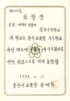 검단국민학교 1983년 우수학교 선정제도에 의한 예체능 전담제 우수학교 선정되어 울주시교육청으로 부터 받은 표창장