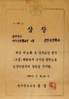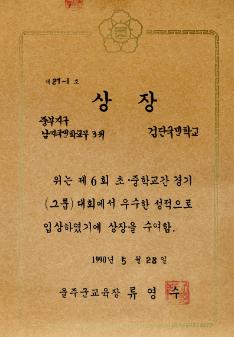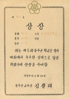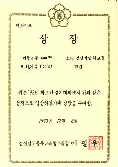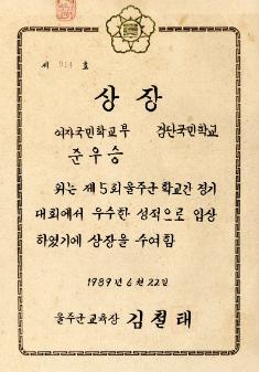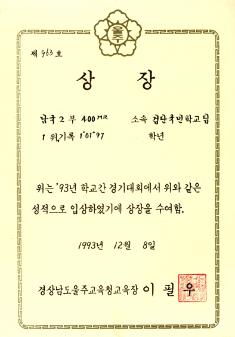 검단국민학교 1993년 학교간 경기대회에서 경상남도울주교육청으로 부터 받은 남국 2부 400MR 1위 상장