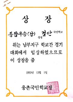 검단국민학교 1993년 남부지구 학교간 경기대회에서 웅촌국민학교로 부터 받은 종합우승(남) 상장