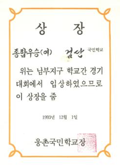 검단국민학교 1993년 남부지구 학교간 경기대회에서 웅촌국민학교로 부터 받은 종합우승(여) 상장