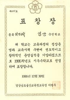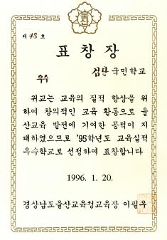 검단국민학교 1996년 95학년도 교육실적 우수학교 선정되어 경상남도울주교육청으로 부터 받은 우수 표창장