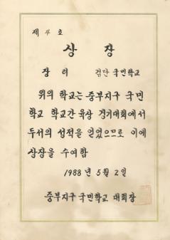 검단국민학교 1988년 중부지구 국민학교 학교간 육상 경기대회에서 중부지구국민학교 대회장으로 부터 받은 장려 상장