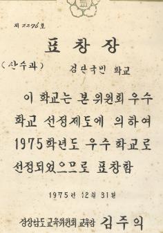 검단국민학교 1975학년도 우수학교 선정제도에 의한 산수과 우수학교로 선정되어 경상남도교육위원회로 부터 받은 표창장