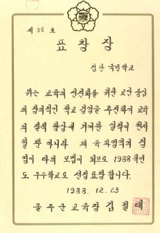 검단국민학교 1988학년도 체육과영역 우수학교로 선정되어 울주군교육청으로 부터 받은 표창장