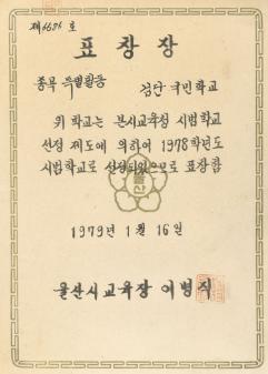 검단국민학교 1979년 1978학년도 특별활동 시범학교로 선정되어 울산시교육청으로 부터 받은 표창장