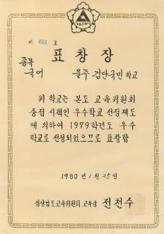 검단국민학교 1980년 1979학년도 국어 우수학교로 선정되어 경상남도교육위원회로 부터 받은 표창장