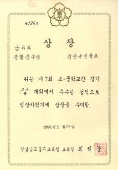 검단국민학교 1991년 제7회 초·중학교간 경기(그룹)대회에서 경상남도울주교육청으로 부터 받은 남자부 종합 준우승 상장