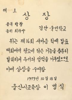 검단국민학교 1979년 제16회 새마음 학예 발표대회에서 울산시교육청으로 부터 받은 합창 최우수 상장