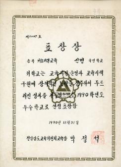 1990학년도 신명국민학교 우수학교 선정 표창장