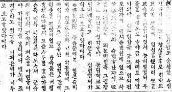 騷擾事件의 後報 ▼ 蔚山 - 이명은 직사   본군의 소요가 연하야 이러남은 임이 보도한 바어니와 쥬모쟈는 데강 톄포한 모양일너라. 5일 오전에 쥬모자라 하는 자 4명은 본군 경찰서에 자현하얏슴으로 곳 수감하얏고 오날은 본부 장날이라. 거시를 식이고 경관과 수비데는 시내 요지에서 엄즁이 경계하얏스나 철시함을 인하야 민심은 더욱 흉흉하는데 병영에서는 천여 명의 군즁이 오후 3시경에 만세를 부르면서 일시에 모혀 여강여취하는 즁 녀자와 아해들도 참가하얏스며 형세는 자못 위험함으로 쥬재소 슌사는 극력으로 진압하얏스나 군즁은 해산이 되지 안코 점점 큰 형세를 이루는 급보를 듯고 경관과 수비데가 급행하여 선동자 7명을 톄포하엿스나 오히려 군즁은 해산이 되지 안코 만세를 연해 부르나 폭행은 서로 경계하며 감히 행치 아니하더니 톄포한 쥬모자를 구인하야 가는 동시에 군즁은 긔세가 위험하고 수비데의 가진 총을 탈취코저 함으로 부득이 발포하야 사상쟈 6명이 잇고 해산되엿스나 다시 모히여 망동할 넘녀가 잇숨으로 경관과 수비데는 엄즁히 경계하는 즁이라더라. <울산> - 쥬모자 14인   본군 언양에서 데소요가 잇섯슴은 임이 보도한 바어니와 본월 4일 오전 12시경에 병영에서 약 6, 7백 명의 군즁은 태극기를 들고 사립 일신학교 압헤 모혀 만세를 불으며 일신학교에 몰녀 들어가서 상학 즁에 잇는 교원 宋從國씨를 압박하면서 선생과 학생도 군즁에 참가하야 만세를 부르라 함에 교원 송종국씨는 불응 함으로 군즁은 교원을 란타하며 압박하는 형세가 위험 함으로 부득이 만세를 불넛스며 군즁은 다시 면사무소에 돌입하야 면서긔 1명을 위협으로 만세를 부르고 다시 슌사 쥬재소 압헤 모히여 열성으로 만세를 부르며 다시 한 군즁을 일워 시쟝을 도라 다니면서 만세를 불너 데소요를 이르키엿스나 다행이 폭동은 업서스며 이 급보를 들은 본부 경찰서원과 수비군데는 쟈전챠를 달녀 급행하여 엄즁이 경계하야 14명의 쥬모쟈의 혐의 잇는 자를 톄포하고 해산시키엿는데 군즁은 서로 경계하며 폭동은 말나 하고 만세만 불을 뿐으로 해산되얏스나 아직 불온한 모양이 잇다더라. <울산통신> 출처 : 대한민국신문아카이브(국립중앙도서관) 매일신보_19190408