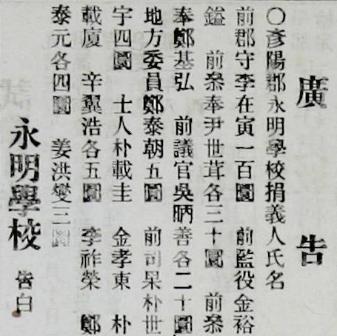廣告 ○ 彦陽郡 永明學校 捐義人 氏名 전 군수 李在寅 1백 원, 전 監役 金裕鎰 전 참봉 尹世茸 각 30원, 전 참봉 鄭基弘 전 議官 吳昞善 각 20원, 地方委員 鄭泰朝 5원, 전 司果 朴世宇 4원, 士人 朴載圭 金孝東 朴載廈 辛翼浩 각 5원, 李祚榮 鄭泰元 각 4원, 姜洪燮 3원. 영명학교 고백. 출처 : 대한민국신문아카이브(국립중앙도서관) 황성신문_19080901