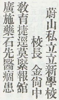 (祝辭) 울산 私立 立新學校 교장 金尙中 敎育捷逕莫緊報舘 廣施藥石先醫痼患. 출처 : 대한민국신문아카이브(국립중앙도서관) 경남일보_19091105