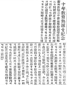 10年 敎育 熱誠을 紀念 경남 언양공립보통학교 훈도 徐周植씨는 동교 창립의 翌年 즉 대정 3년도에 부임하야 이래 10년간을 하로와 갓치 성심성의로 교육사업에 만은 노력이 잇섯는 동시에 씨의 지도를 밧아 동교를 졸업한 생도가 9회간 2백여 명에 달하얏슴으로 일반 학부형과 졸업생들은 매우 감사히 생각하는 동시에 씨의 10년간 교육사업에 근무하얏슴을 기념하기 위하야 학부형 측으로셔는 金洪經, 吳溢根, 鄭泰朝, 李圭相 제씨 외 7인의 발기로 일반 학부형의게 백여 원의 찬조금을 수합하야 寢牀器 1式 외 귀중품을 작만하얏스며 졸업생 측으로셔는 金圭煥, 李仁滿, 姜錫祿, 吳寅泳 제씨의 발기로 일반 졸업생의게 50여 원의 찬연금을 밧아 純銀盃 1組 외에 역시 귀중품을 작만하야 거월 27일에 보통학교 내에서 기념품 進呈式을 성대히 거행하얏다더라. (언양) 출처 : 네이버뉴스라이브러리 조선일보_19240105