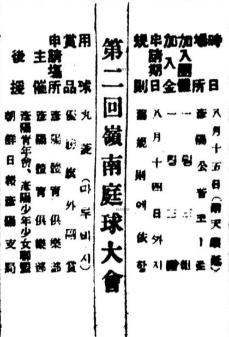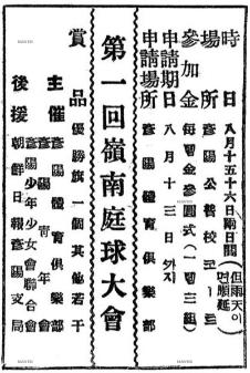 (광고) 第2回 嶺南庭球大會 시일 8월 15일(雨天 順延) 장소 彦陽公普코-트 가입단체 1틤 3組 가입금 1틤 3원 신청기일 8월 14일까지 規則 舊規則에 의함 用球 丸菱(마루비시) 상품 우승기 외 부상 신청장소 彦陽體育俱樂部 주최 언양체육구락부 후원 彦陽靑年會, 彦陽少年少女聯盟, 朝鮮日報 彦陽支局. 출처 : 네이버뉴스라이브러리 조선일보_19260814