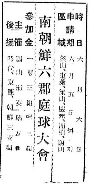 (광고) 南朝鮮6郡庭球大會 시일 6월 6일 신청기 6월 5일까지 구역 부산, 동래, 양산, 경주, 포항, 울산 참가금 1템 3조에 단체 주최 蔚山 海英學友會 후원 시대, 동아, 조선 3지국. 출처 : 네이버뉴스라이브러리 조선일보_19260531