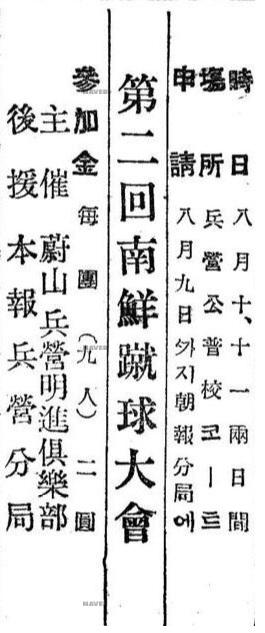 (광고) 제2회 南鮮蹴球大會 시일 8월 10, 11 양일간 장소 병영공보교 코-트 신청 8월 9일까지 朝報分局에 참가금 每團(9인) 2원 주최 울산 兵營 明進俱樂部 후원 본보 兵營分局. 출처 : 네이버뉴스라이브러리 조선일보_19270809