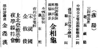 (광고) 삼동 둔기리 芚基義塾 중남공립보통학교 직원 일동 언양공립심상소학교 직원 일동 학교평의원 鄕校直員 면협의원 金相龜 두서공보교 洪在龍 길천공립보교 宋從國 金攸俊 상북 등억노동야학 維持會 학교평의원 金瀅漢. 출처 : 조선일보_19290101