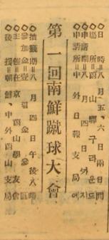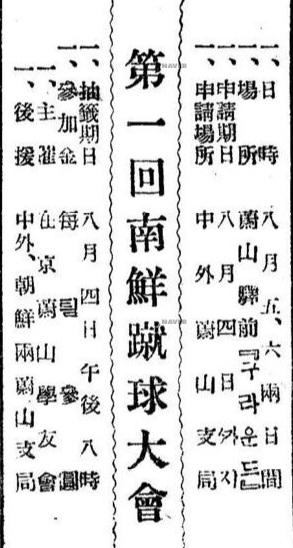 (광고) 第1回 南鮮蹴球大會 일시 8월 5, 6 양일간 장소 蔚山驛前 그라운드 신청 8월 4일까지 中外 蔚山支局으로 참가금 每 템 金3원 추첨 8월 4일 오후 8시 주최 在京蔚山學友會 후원 중외, 조선 울산 양 지국. 출처 : 네이버뉴스라이브러리 조선일보_19300719