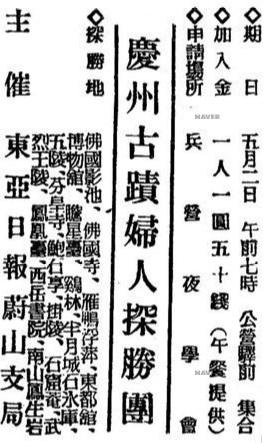 (광고) 慶州古蹟婦人探勝團 ◇ 기일 5월 2일 오전 7시 공영역전 집합 ◇ 가입금 1인 1원 50전(오찬 제공) ◇ 신청장소 兵營夜學會 ◇ 탐승지 佛國影池, 불국사, 雁鴨浮萍, 東都舘, 박물관, 첨성대, 계림, 반월성 석빙고, 오릉, 분황사, 포석정, 괘릉, 석굴암, 무열왕릉, 봉황대, 西岳書院, 남산 鳳生岩 주최 동아일보 울산지국. 출처 : 네이버뉴스라이브러리 동아일보_19340502