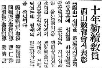 10年 勤續 敎員 - 蔚山敎育會서 表彰 【울산】 10년을 하로 가치 꾸준히 아동 교육에 성의를 바친 10년 근속 공로자의 표창식은 지난 16일 蔚山읍 태화공립심상소학교 강당에서 개최된 울산군 교육총회 석상에서 성대히 거행되엇는데 영예의 피표창자는 다음 3씨이다. 蔚山郡 新岩小學校 鮫島 校長 同 鶴城小學校 訓導 曹仁澤 同 溫陽小學校 訓導 姜濟宗. 출처 : 네이버뉴스라이브러리 조선일보_19400726