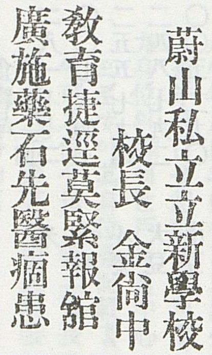 교장 金尙中 敎育捷逕莫緊報舘 廣施藥石先醫痼患.