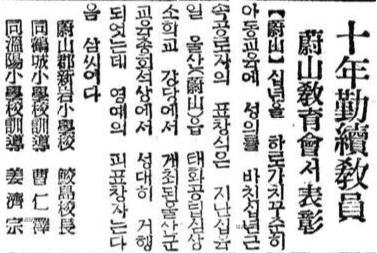 【울산】 10년을 하로 가치 꾸준히 아동 교육에 성의를 바친 10년 근속 공로자의 표창식은 지난 16일 蔚山읍 태화공립심상소학교 강당에서 개최된 울산군 교육총회 석상에서 성대히 거행되엇는데 영예의 피표창자는 다음 3씨이다. 蔚山郡 新岩小學校 鮫島 校長 同 鶴城小學校 訓導 曹仁澤 同 溫陽小學校 訓導 姜濟宗.