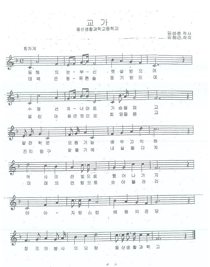 울산생활과학고등학교의 교가 악보로 김성춘 작사, 김창근 작곡이다.