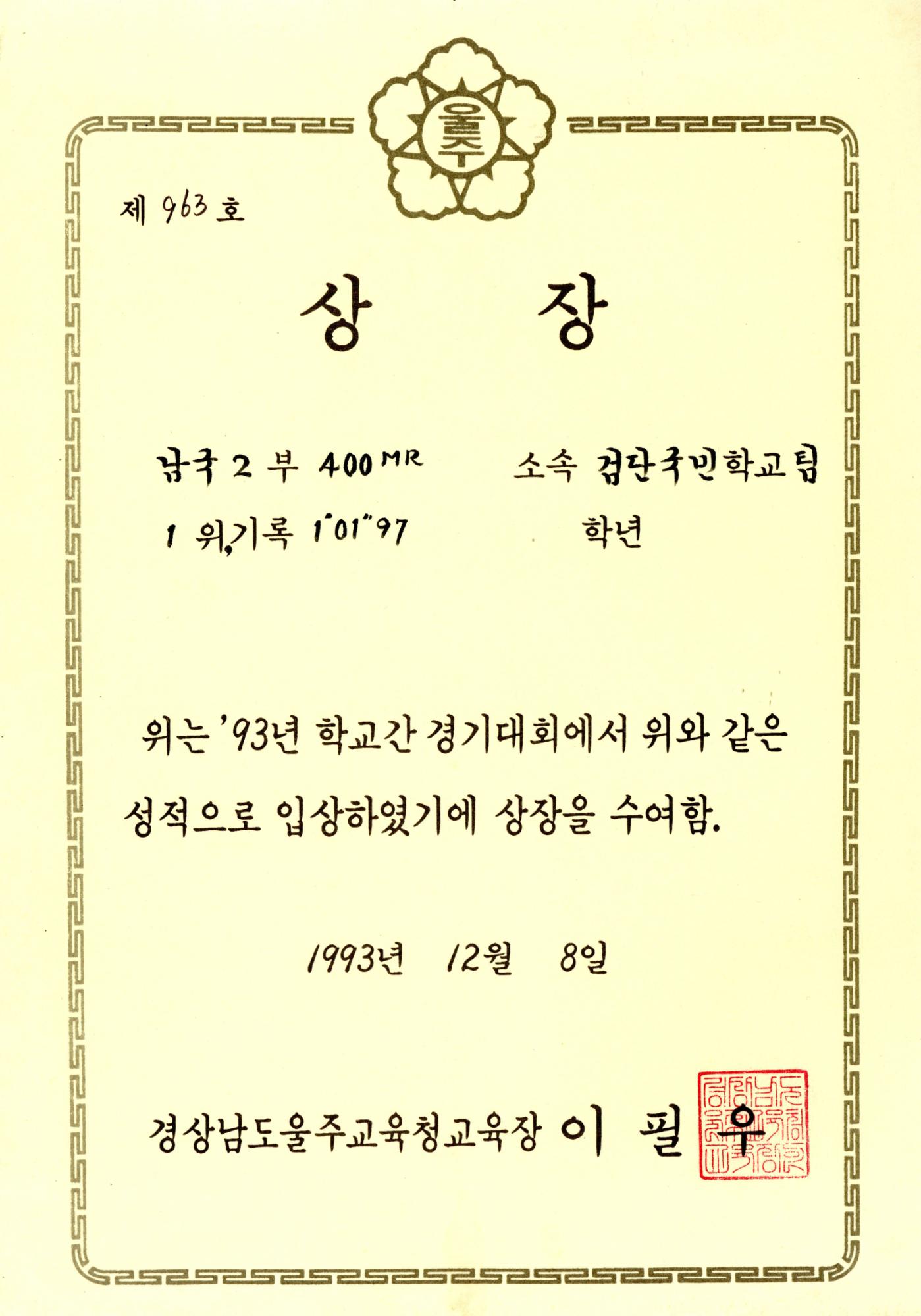 검단국민학교 1993년 학교간 경기대회에서 경상남도울주교육청으로 부터 받은 남국 2부 400MR 1위 상장