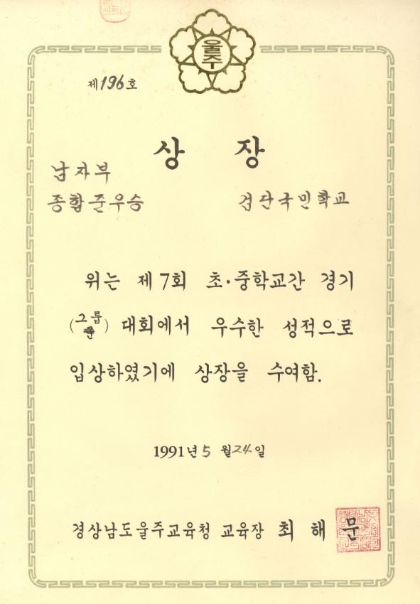 검단국민학교 1991년 제7회 초·중학교간 경기(그룹)대회에서 경상남도울주교육청으로 부터 받은 남자부 종합 준우승 상장