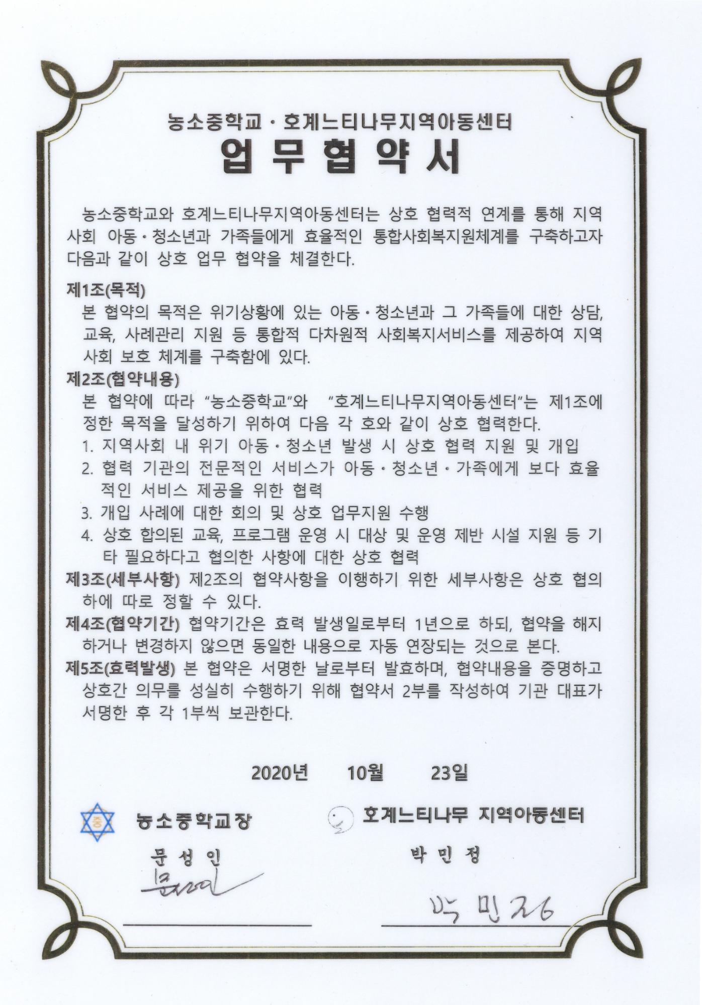 농소중학교 2020년 농소중학교-호계느티나무지역아동센터간 맺은 업무협약서