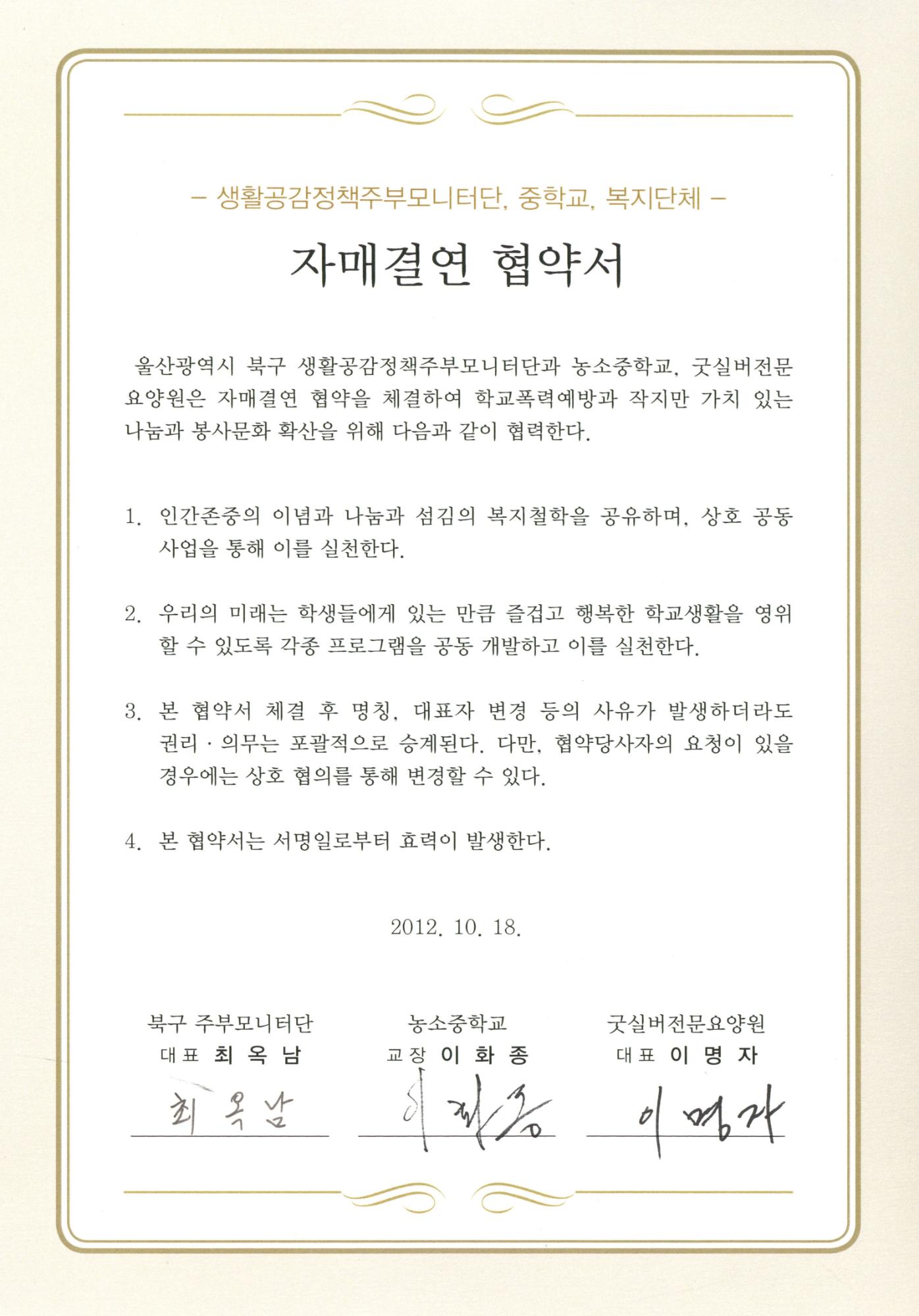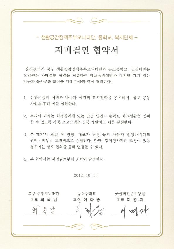 농소중학교 2012년 생활공감정책주부모니터단-농소중학교-복지단체간 자매결연협약서