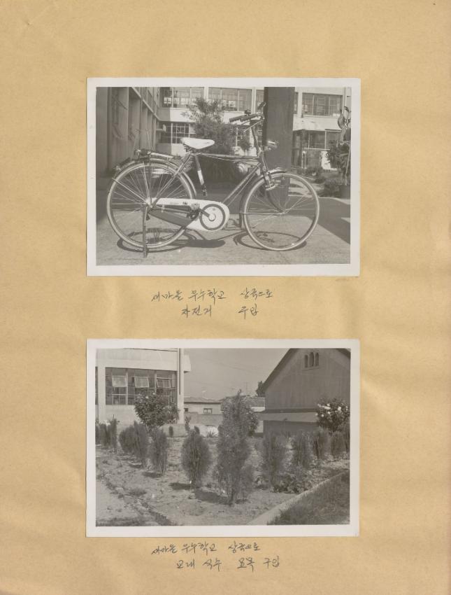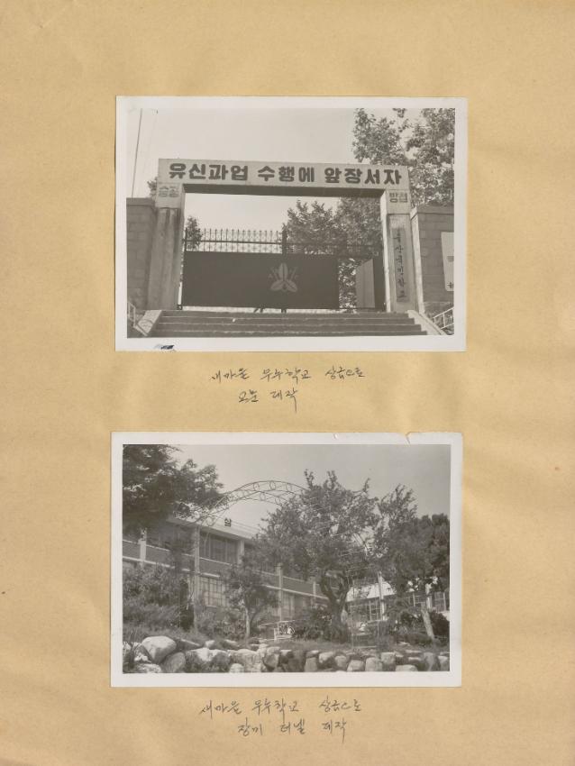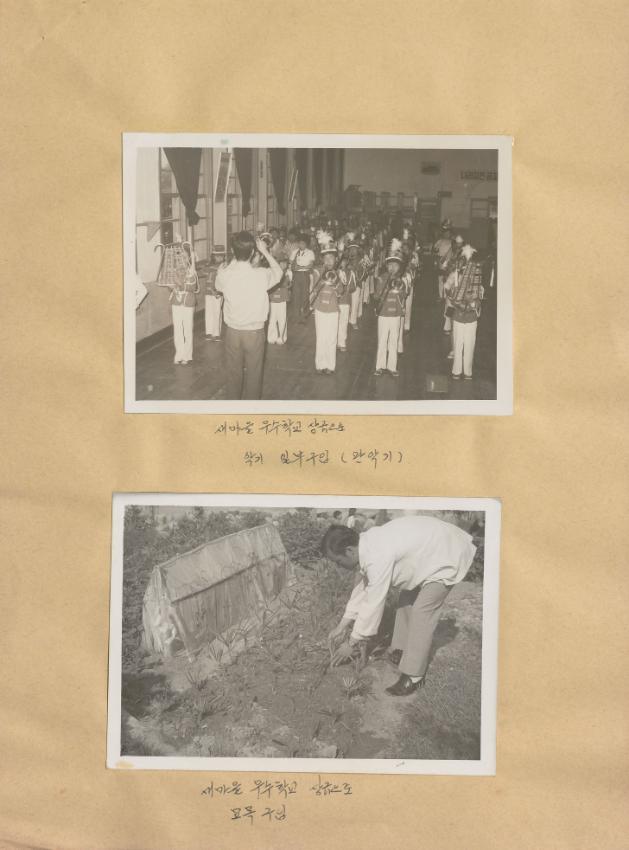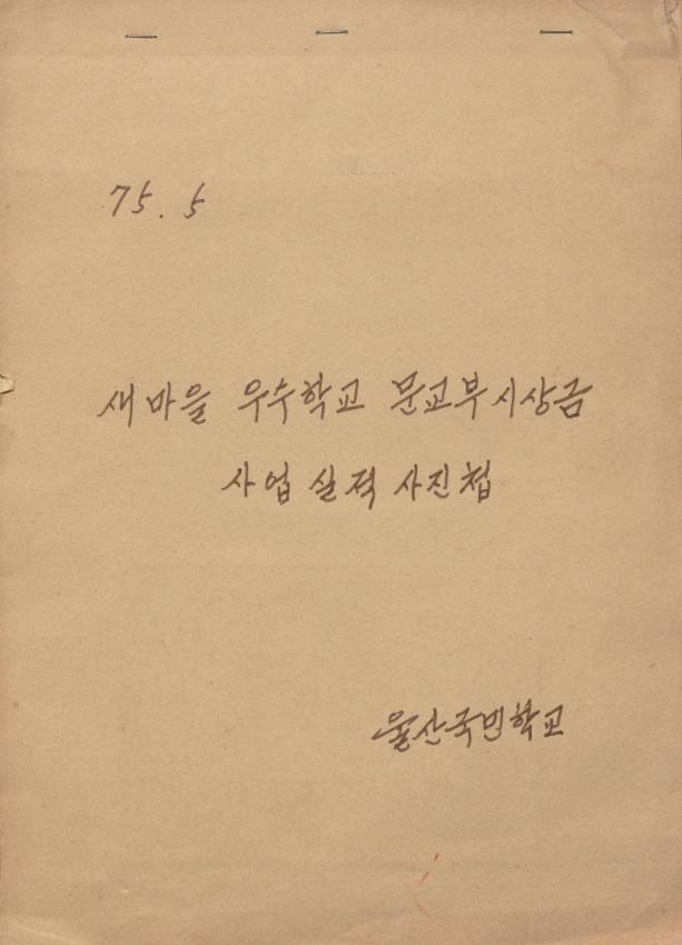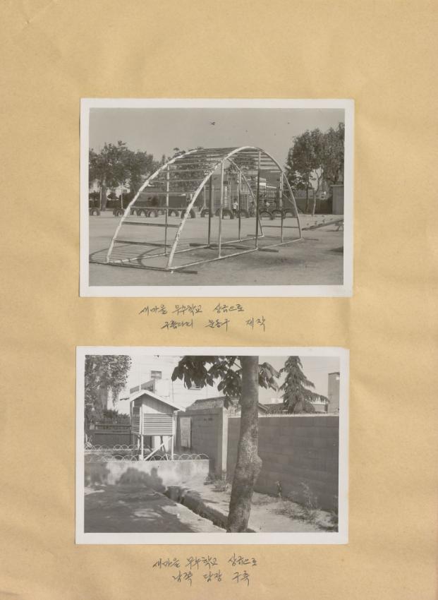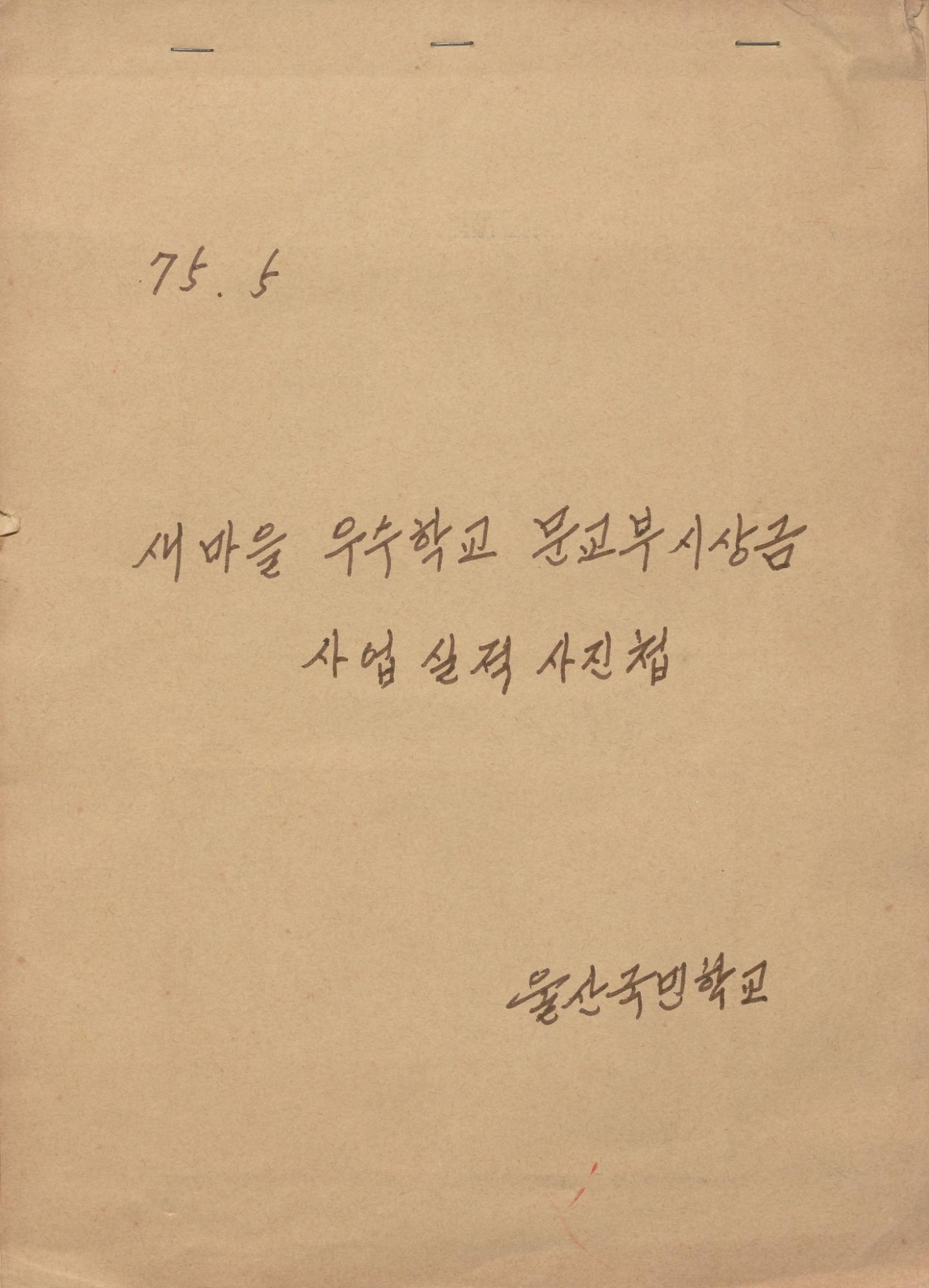 울산국민학교 1975년 5월 새마을 우수학교 문교부시상금으로 교내 식수 및 묘목, 관악기 일부 구입, 구름다리 운동구 제작, 남쪽 담장 구축 등 사업 실적 사진 포함