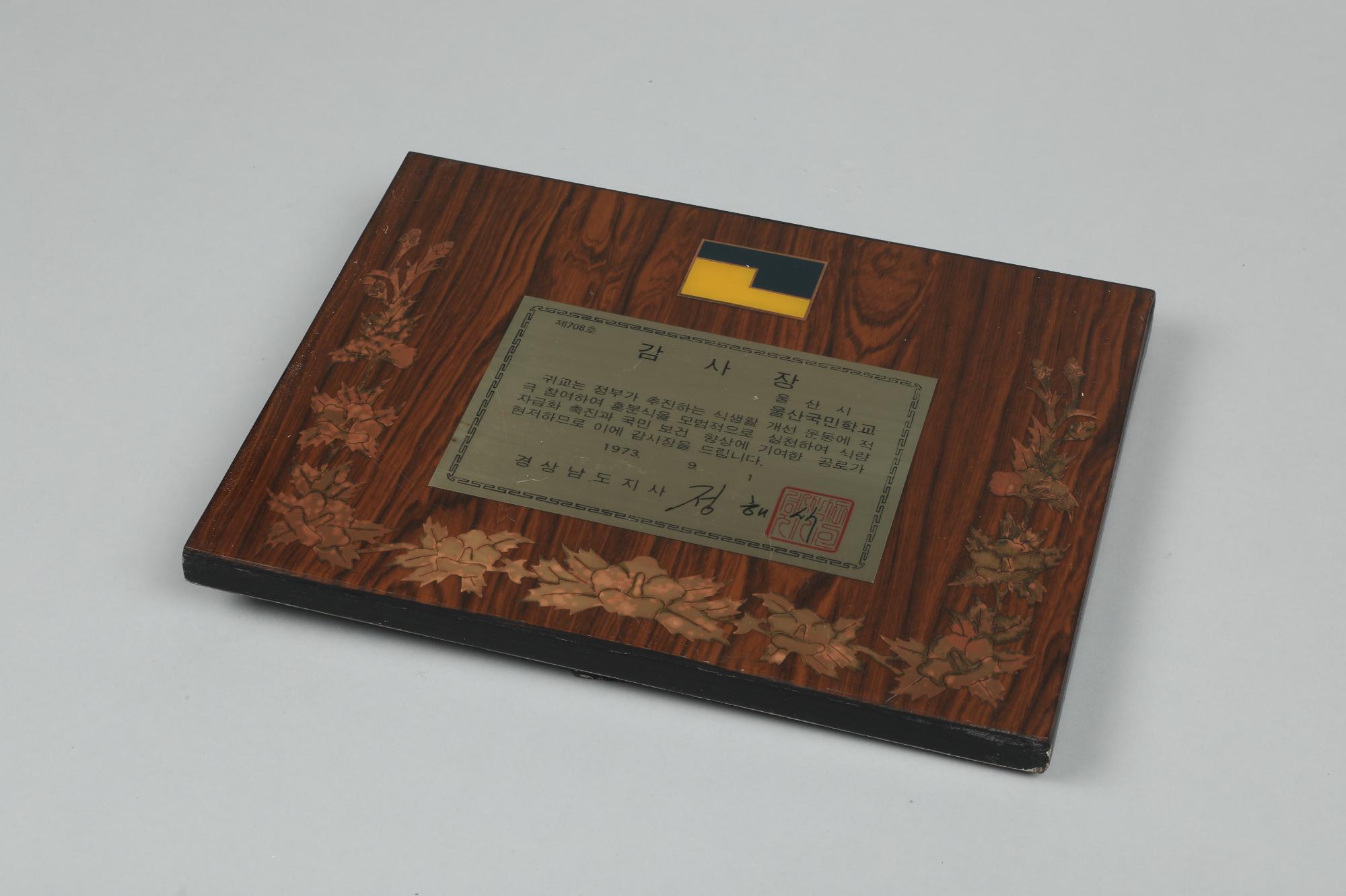 울산국민학교 1973년 경상남도로 부터 받은 식생활 개선 운동 감사장 상패