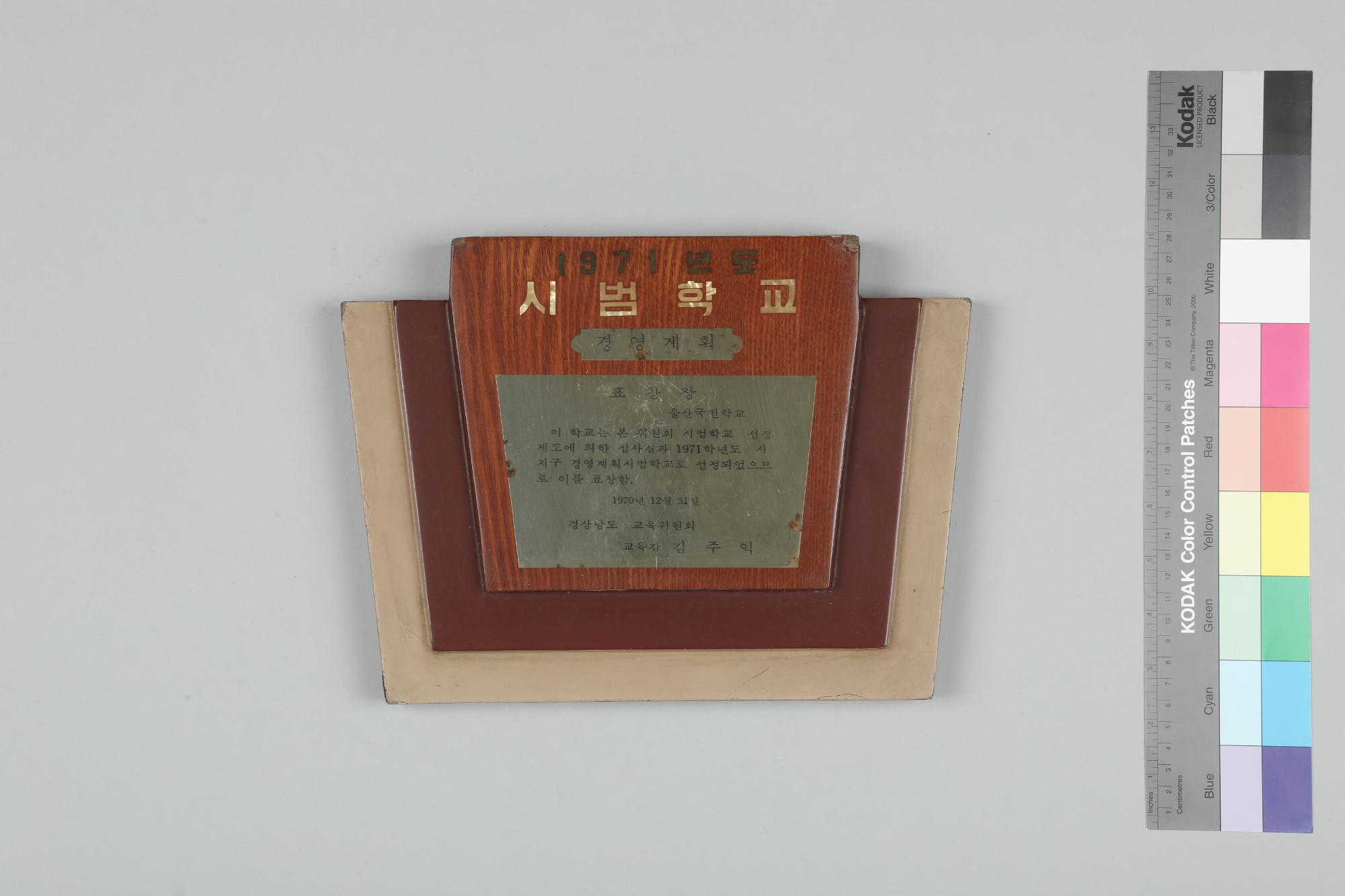 울산국민학교 1970년 경상남도교육위원회로 부터 받은 1971년도 경영계획 시범학교 선정 표창장 상패