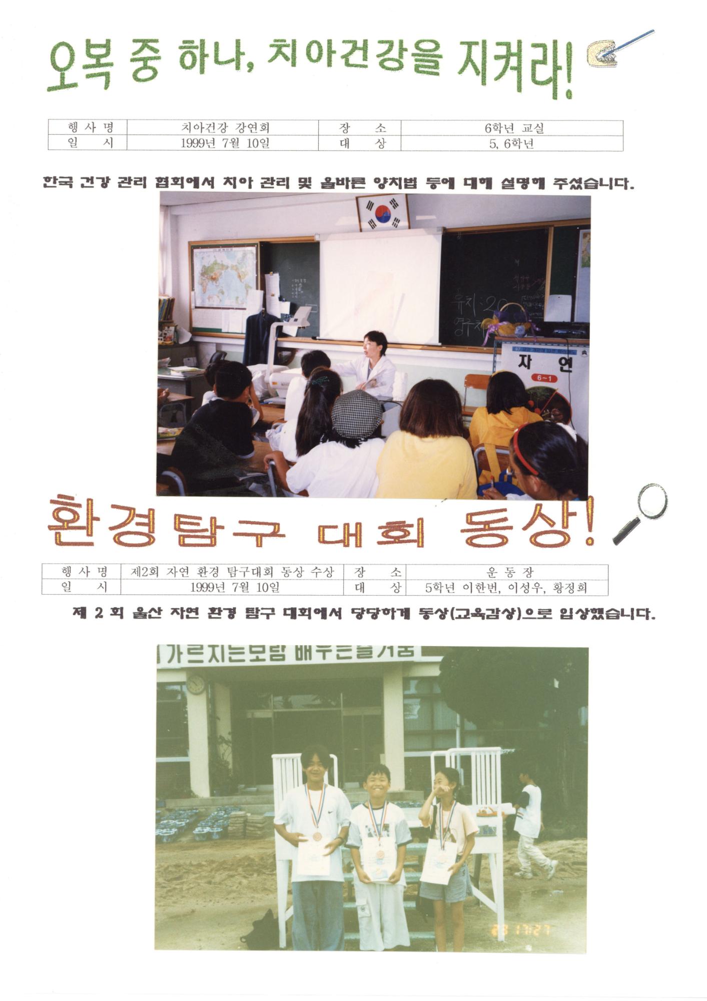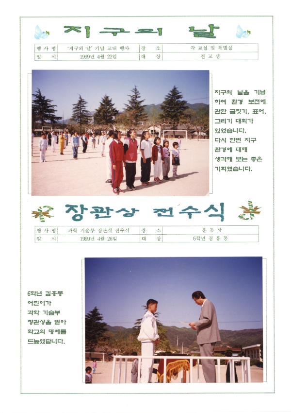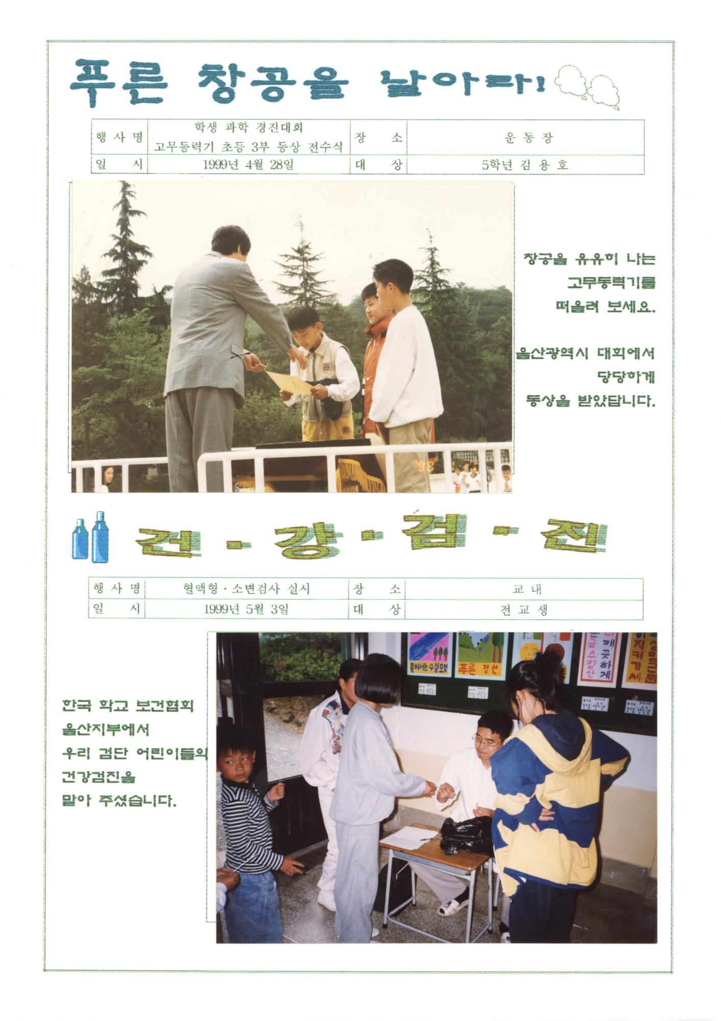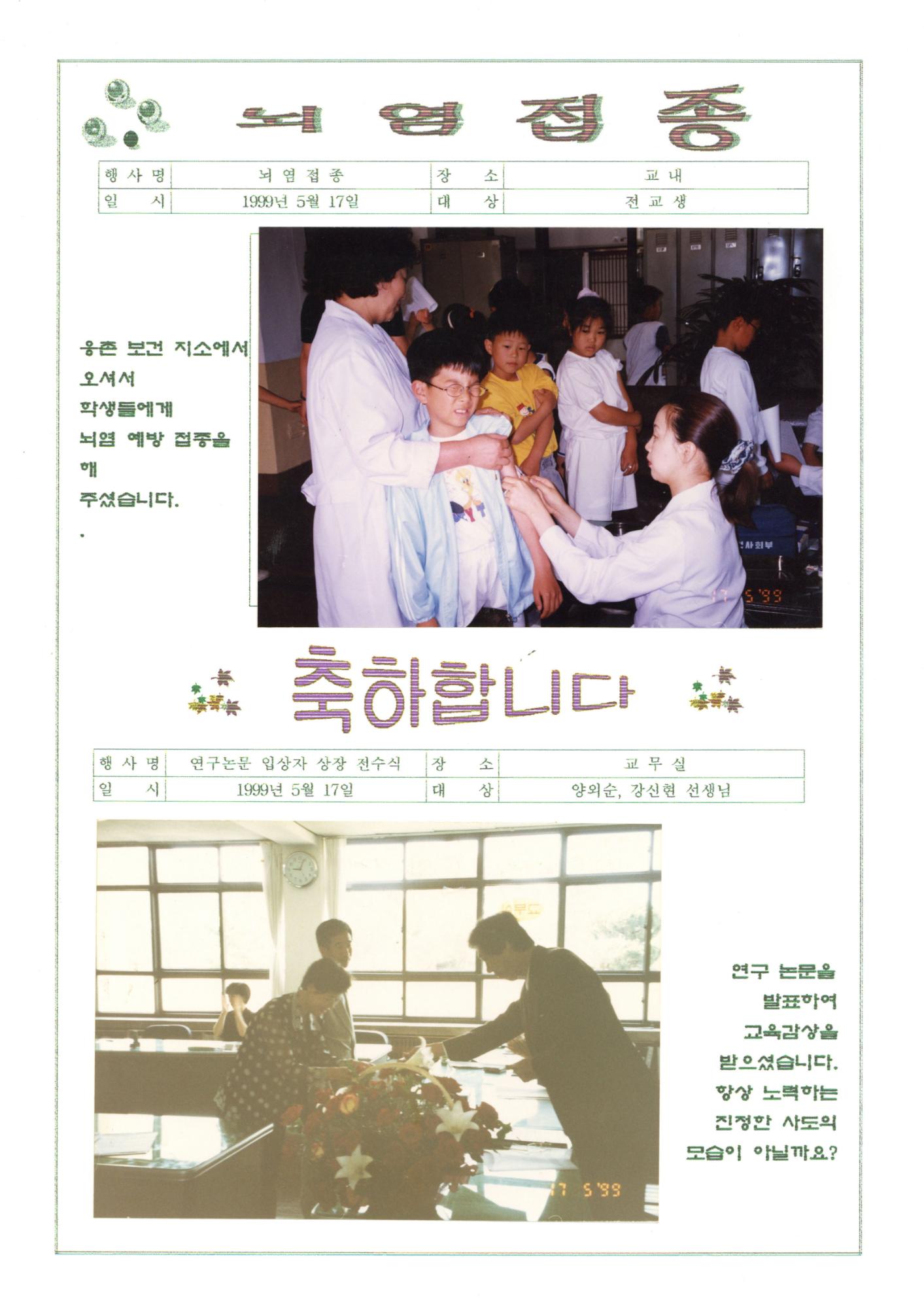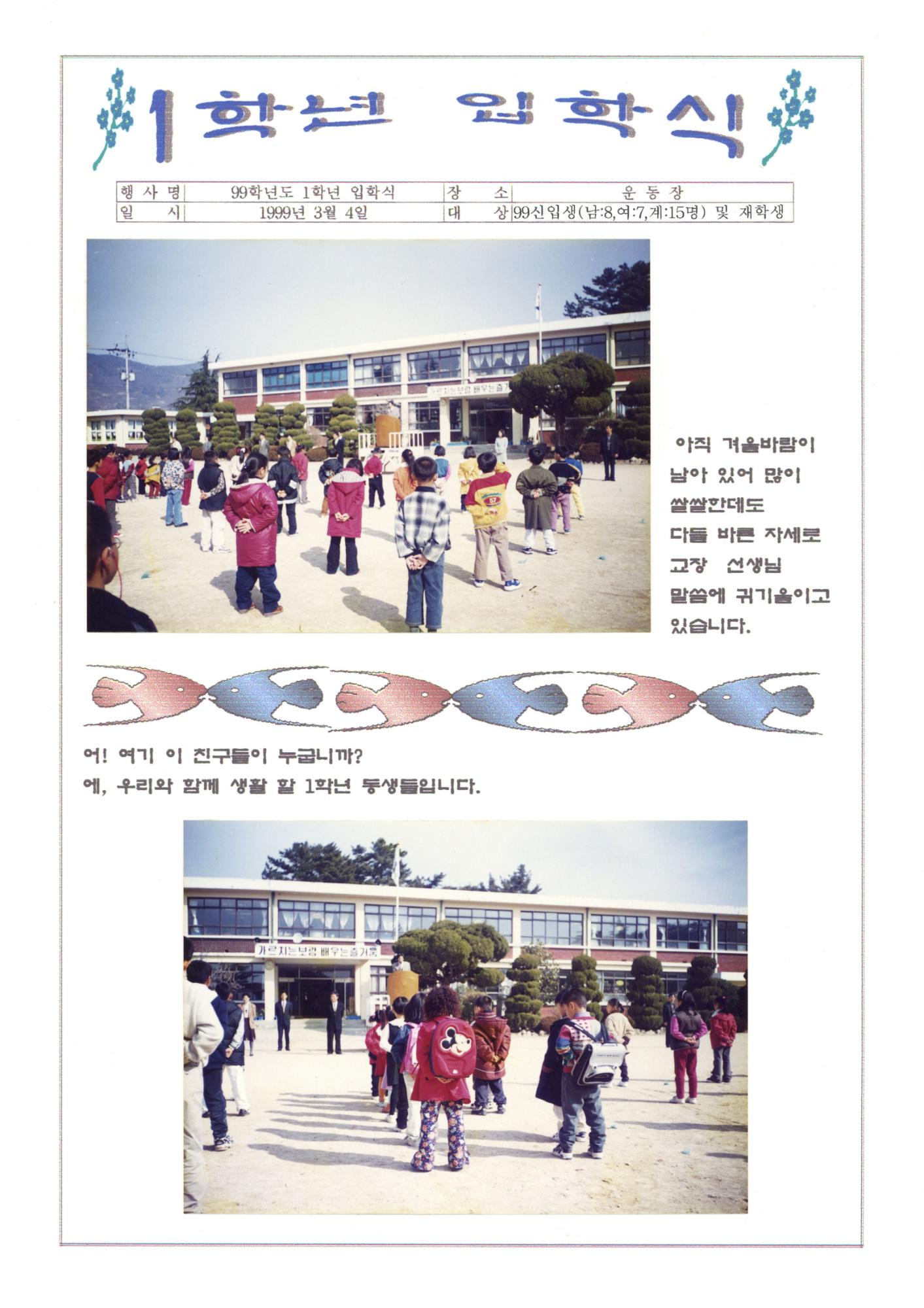 검단초등학교 1999학년도 학교발전사진첩 (99 학교 경영사진첩)_1999학년도 입학식, 전교어린이회 임원 선출, 학생 건강 검진, 장관상 전수식, 전반기 장학 협의회 실시, 뇌염 접종, 총동창회, 학교 보수·정비 공사 등 학교발전사진첩 (99 학교 경영사진첩)