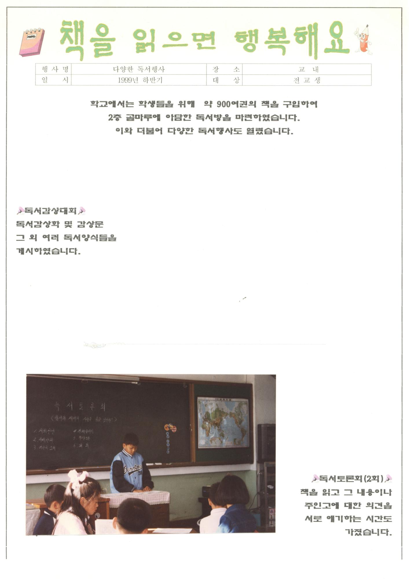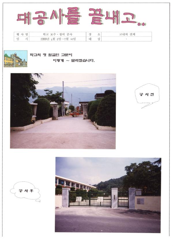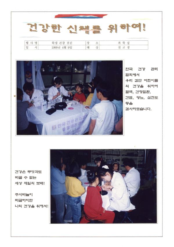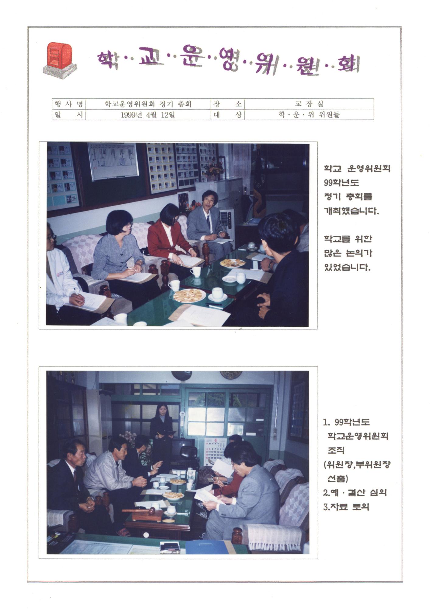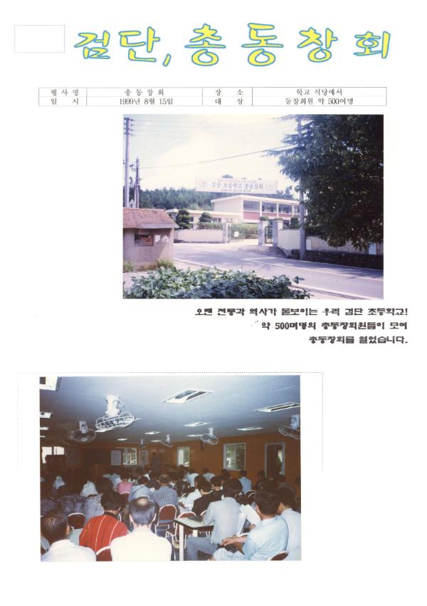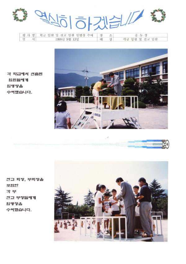 검단초등학교 1999학년도 학교발전사진첩 (99 학교 경영사진첩)_1999학년도 입학식, 전교어린이회 임원 선출, 학생 건강 검진, 장관상 전수식, 전반기 장학 협의회 실시, 뇌염 접종, 총동창회, 학교 보수·정비 공사 등 학교발전사진첩 (99 학교 경영사진첩)