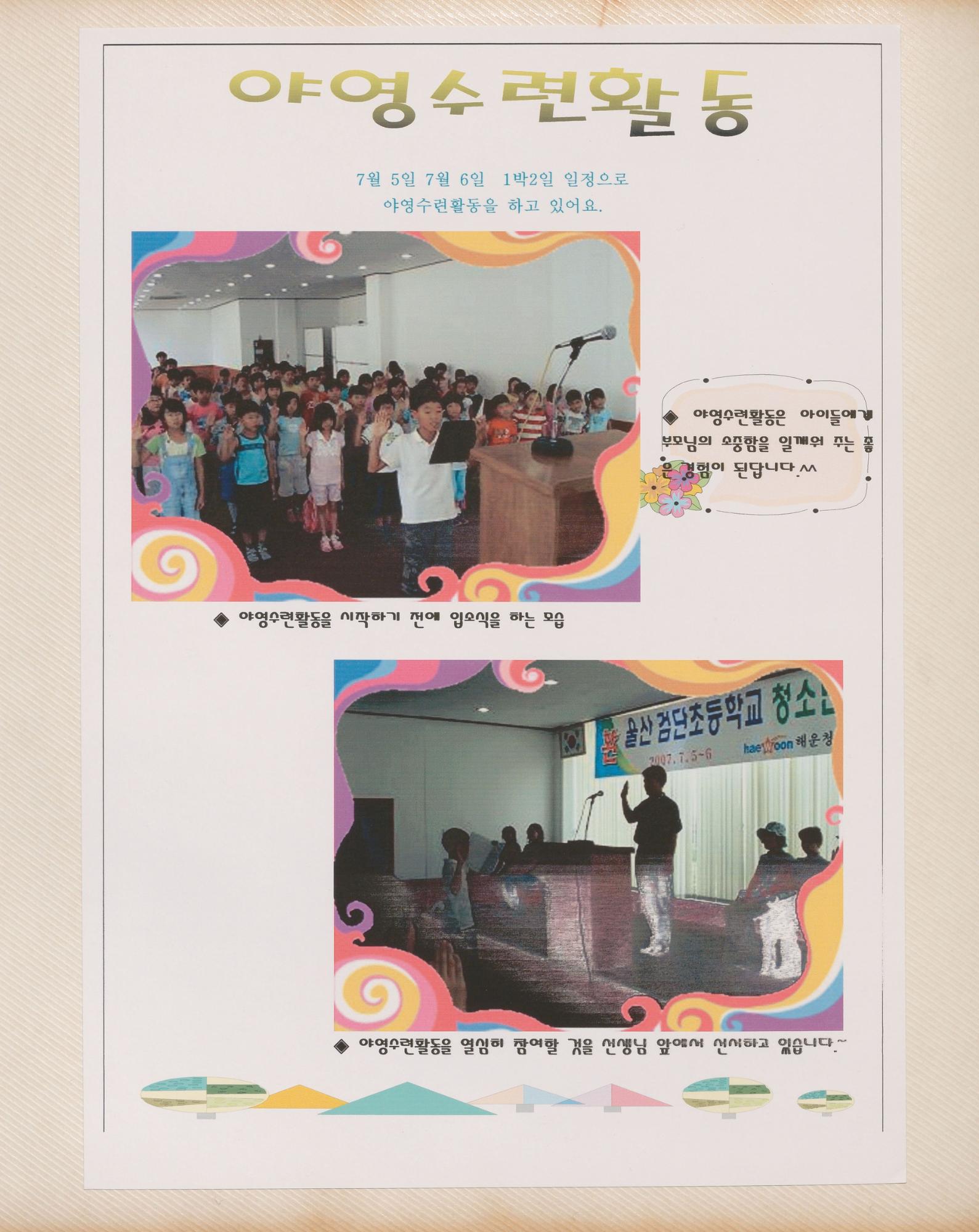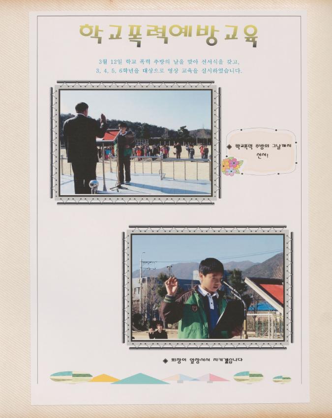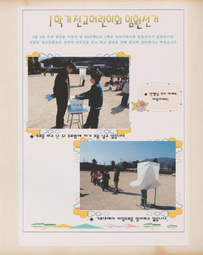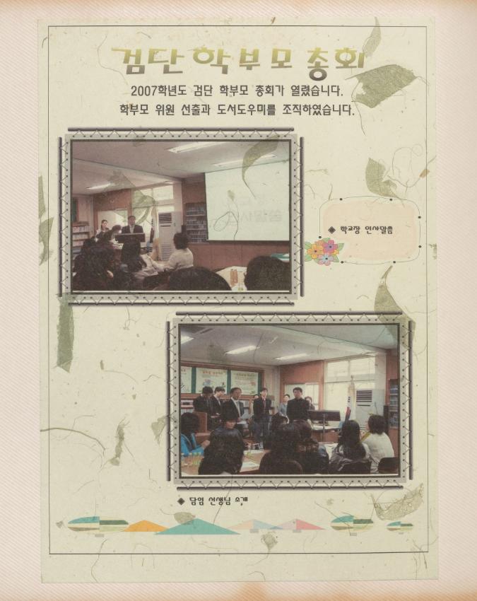 검단초등학교 2007학년도 학교경영사진첩_입학식, 전교어린이회 임원 선출, 학교폭력예방교육, 구강 교육 및 불소도포, 교통안전교육, 과학탐구대회, 한마음가족대운동회, 가을현장체험학습 등 학교경영사진첩