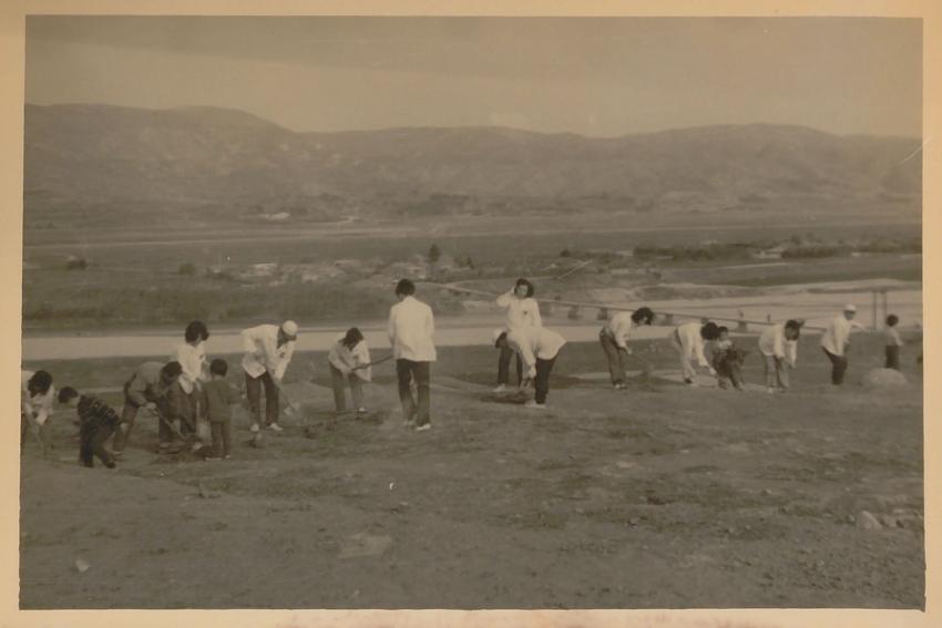 병영국민학교 1972년 삼일사 광장 둘레에 직원들이 앞장서 측백나무를 심고 있는 사진