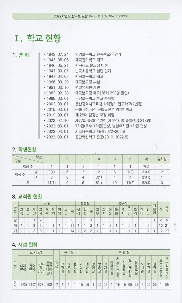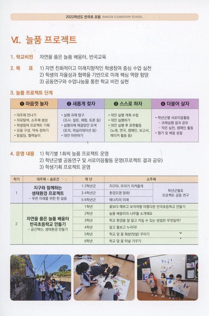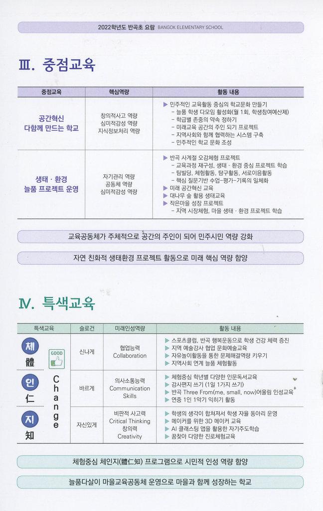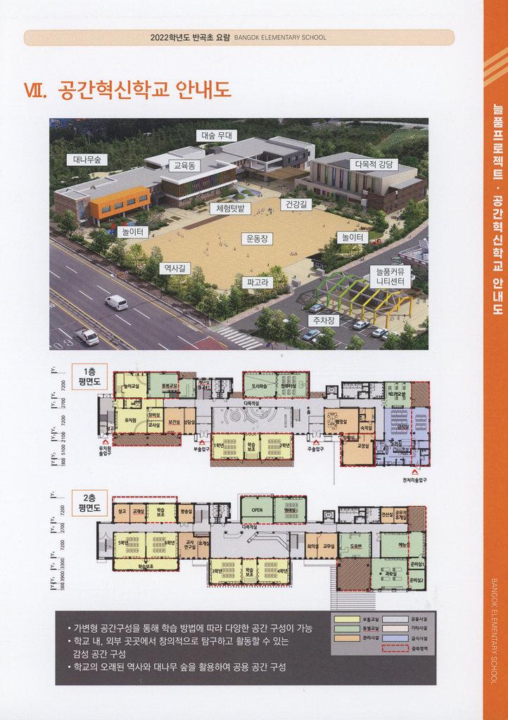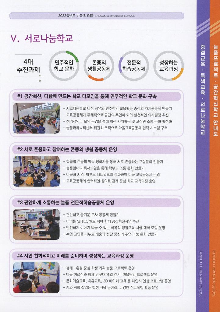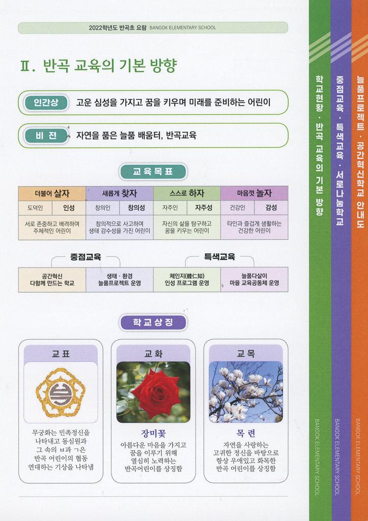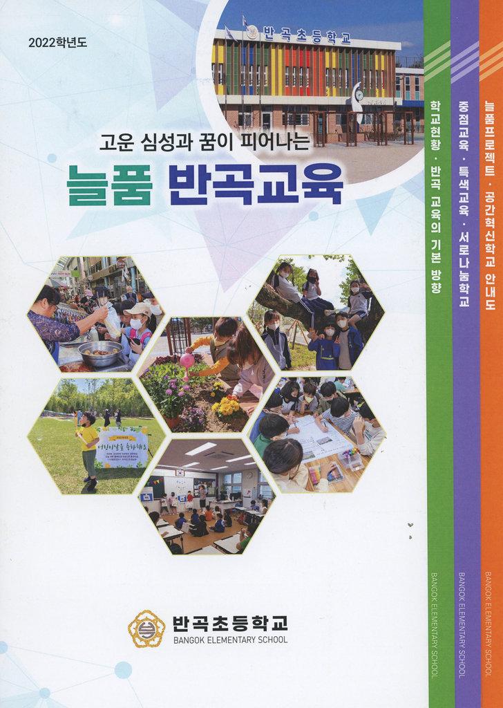 반곡초등학교 2022년도의 학교현황과 반곡교육의 기본방향, 중점교육과 특색교육 그리고 서로나눔교육, 늘품프로젝트와 공간혁신안내도의 내용이 들어가있는 팜플렛이다.